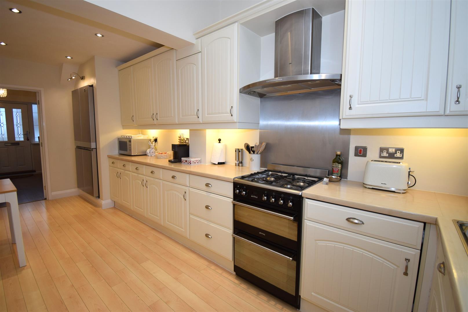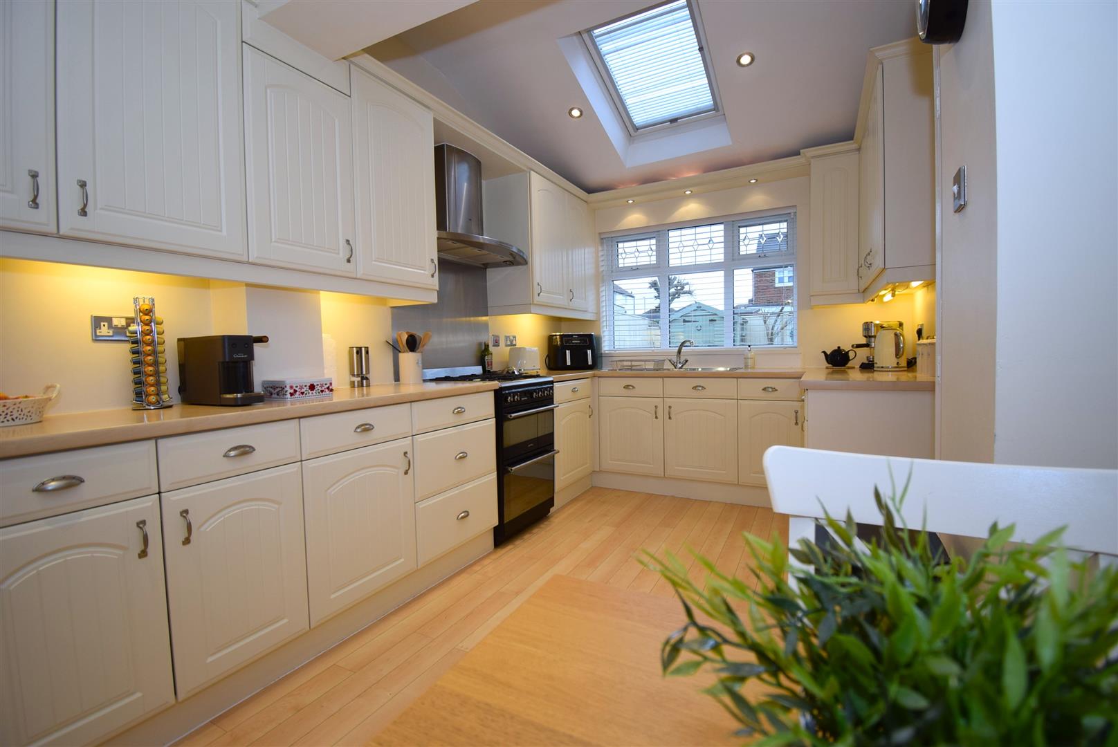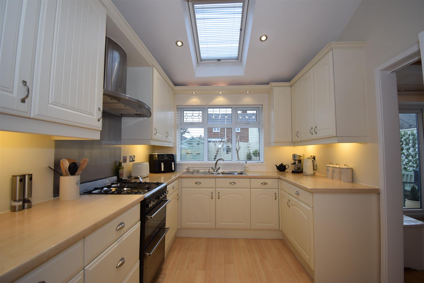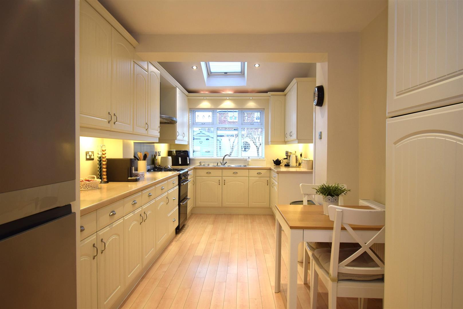 A lovely sized kitchen with an extensive range of fitted wall and base units housing a sink unit, double filter hood, integral dishwasher and washer, a range of under unit lights and spot lighting with natural light flooding in via a velux style window, laminate floor and a radiator