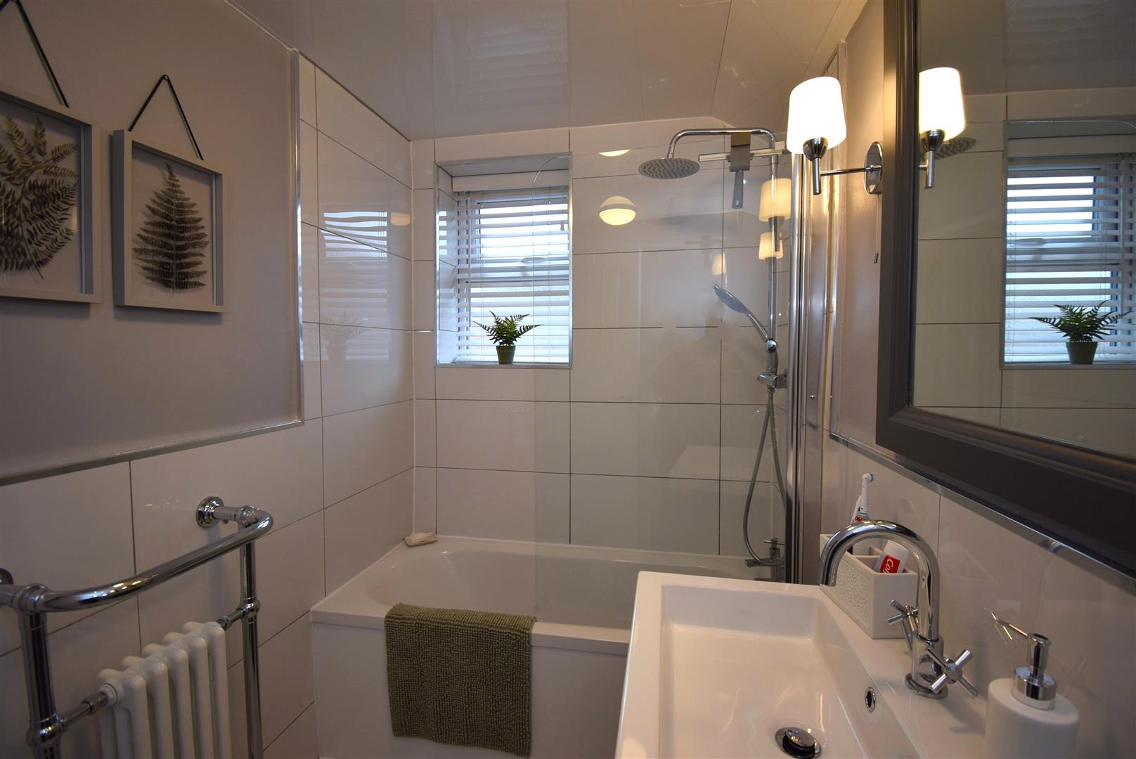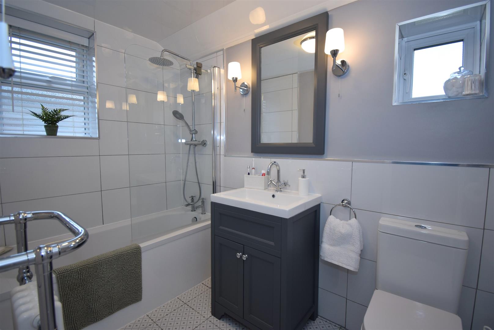 A stylish bathroom with a three piece suite comprising a bath with mixer shower over having both drencher and spray shower heads, shower screen, a vanity unit houses the wash basin and there are wall lights above, WC, half tiled walls and a tiled floor, Victorian style towel radiator