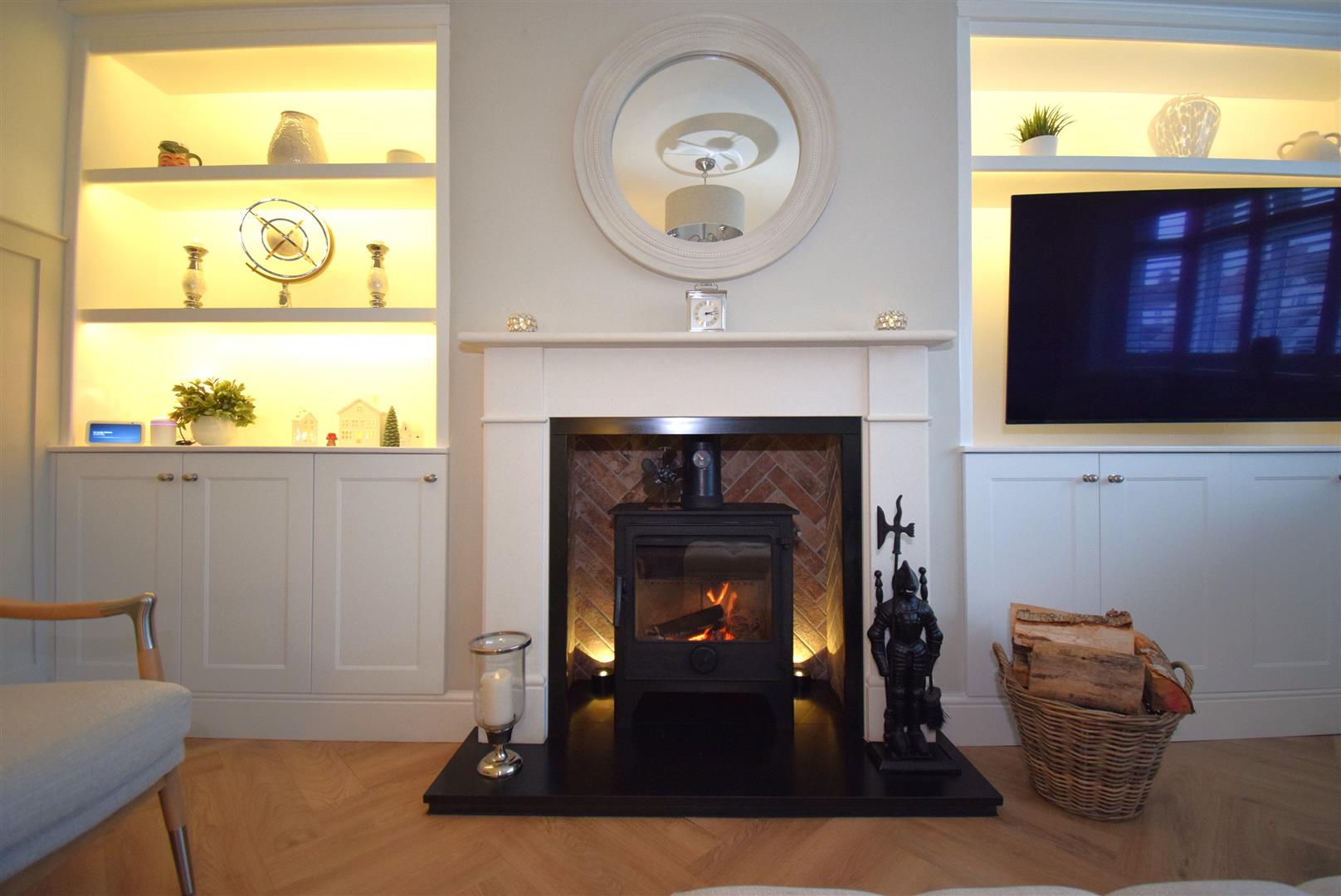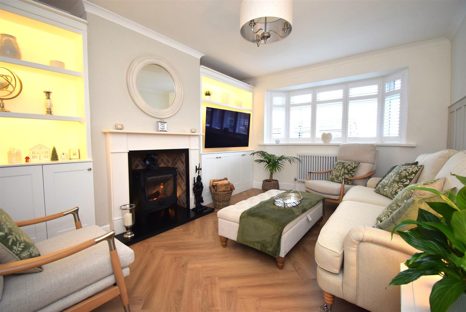 Recently remodelled and upgraded with wonderful bespoke fitted alcove units with cupboards, shelves and LED display lighting. There's a fire surround with inset log burner set on a black stone hearth with herringbone brickwork back, bay window with plantation shutters, cast style radiator and feature panelling to the walls and herringbone flooring.
