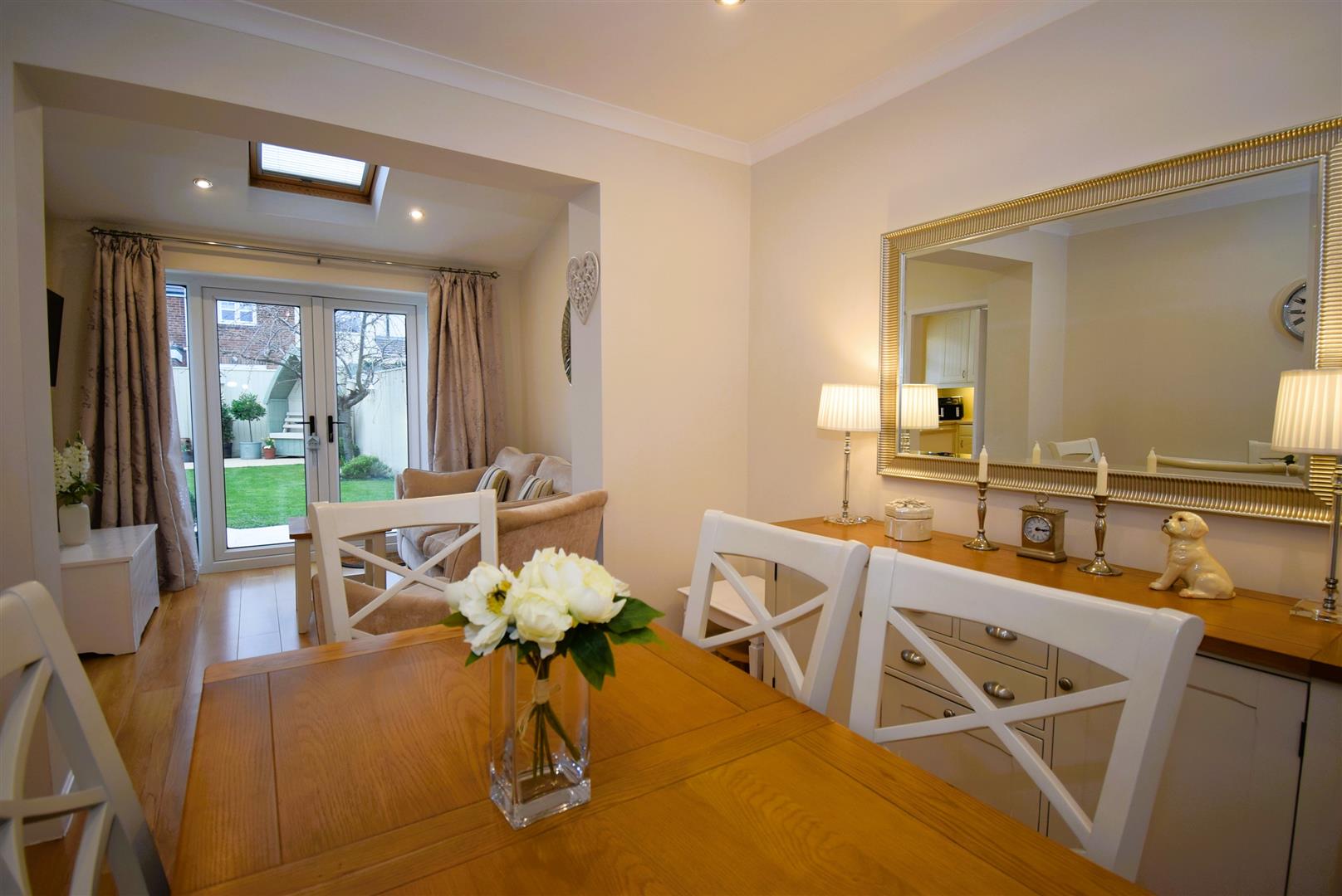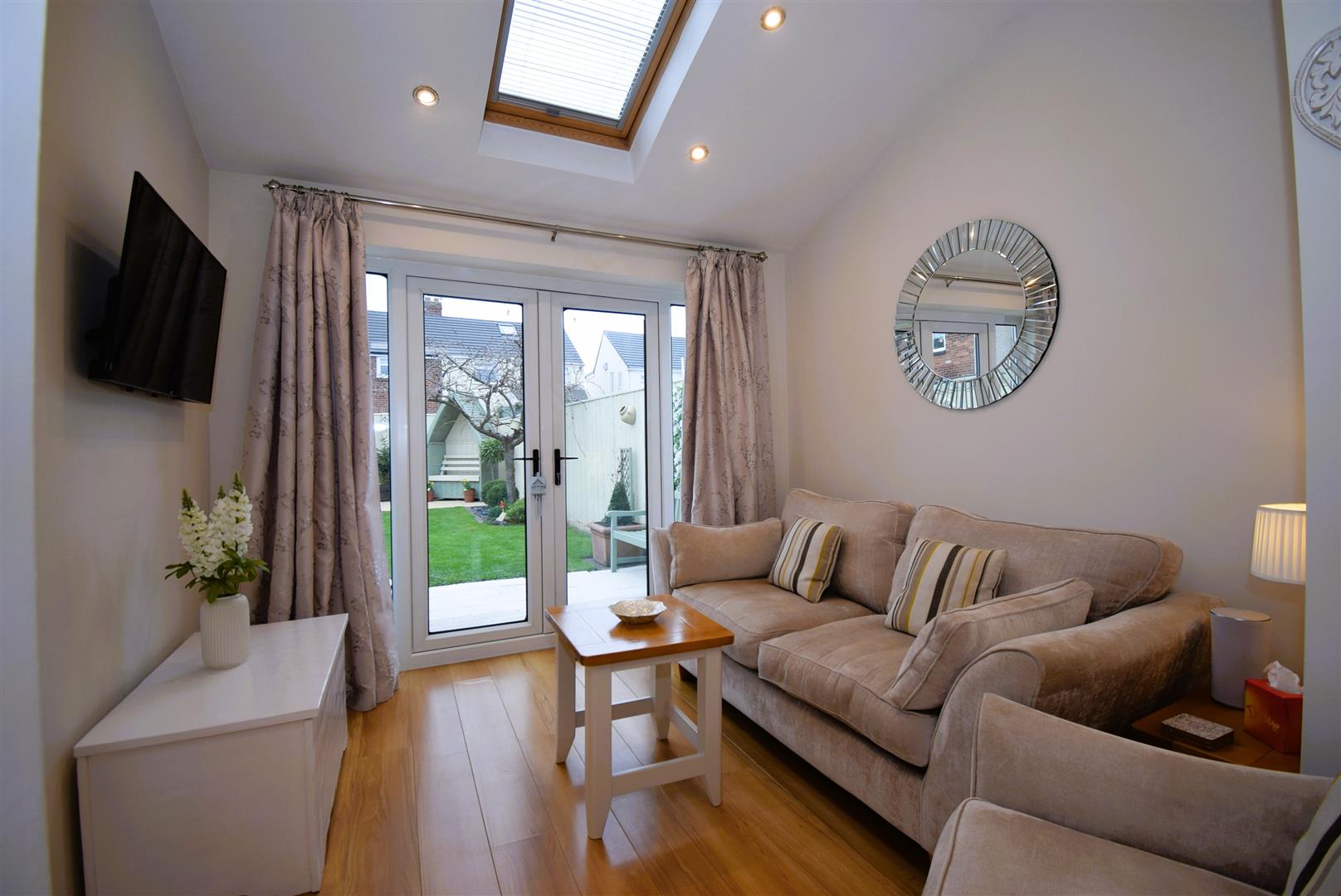 French doors overlooking the south west aspect gardens, velux style window, spot lights and laminate floor