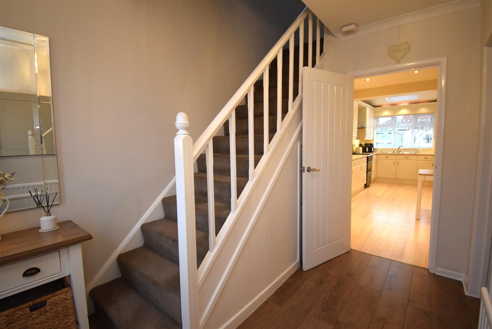 Stairs to the first floor, cupboard under, laminate floor and a radiator. Cottage style doors lead to the reception rooms