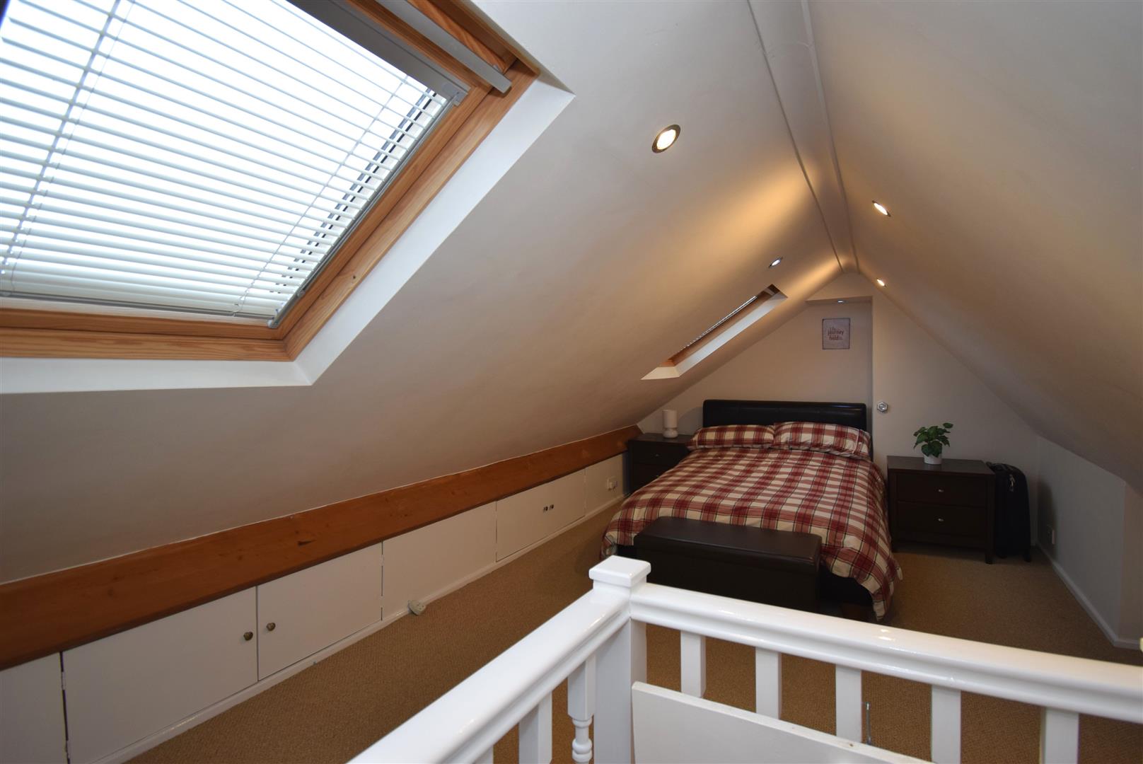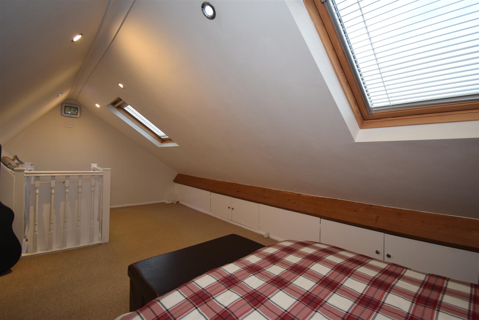 A versatile loft space with velux windows, radiator, power and light with built in eaves level storage
