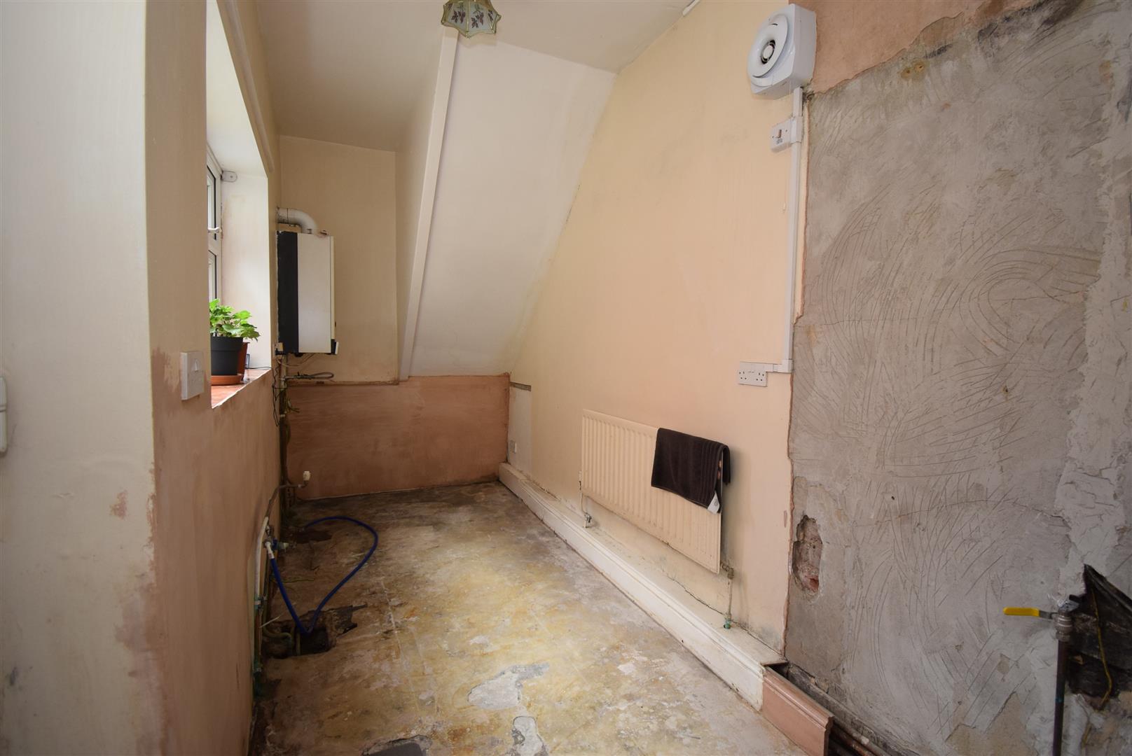 An empty kitchen requiring fitting out. There is the central heating boiler and a radiator.