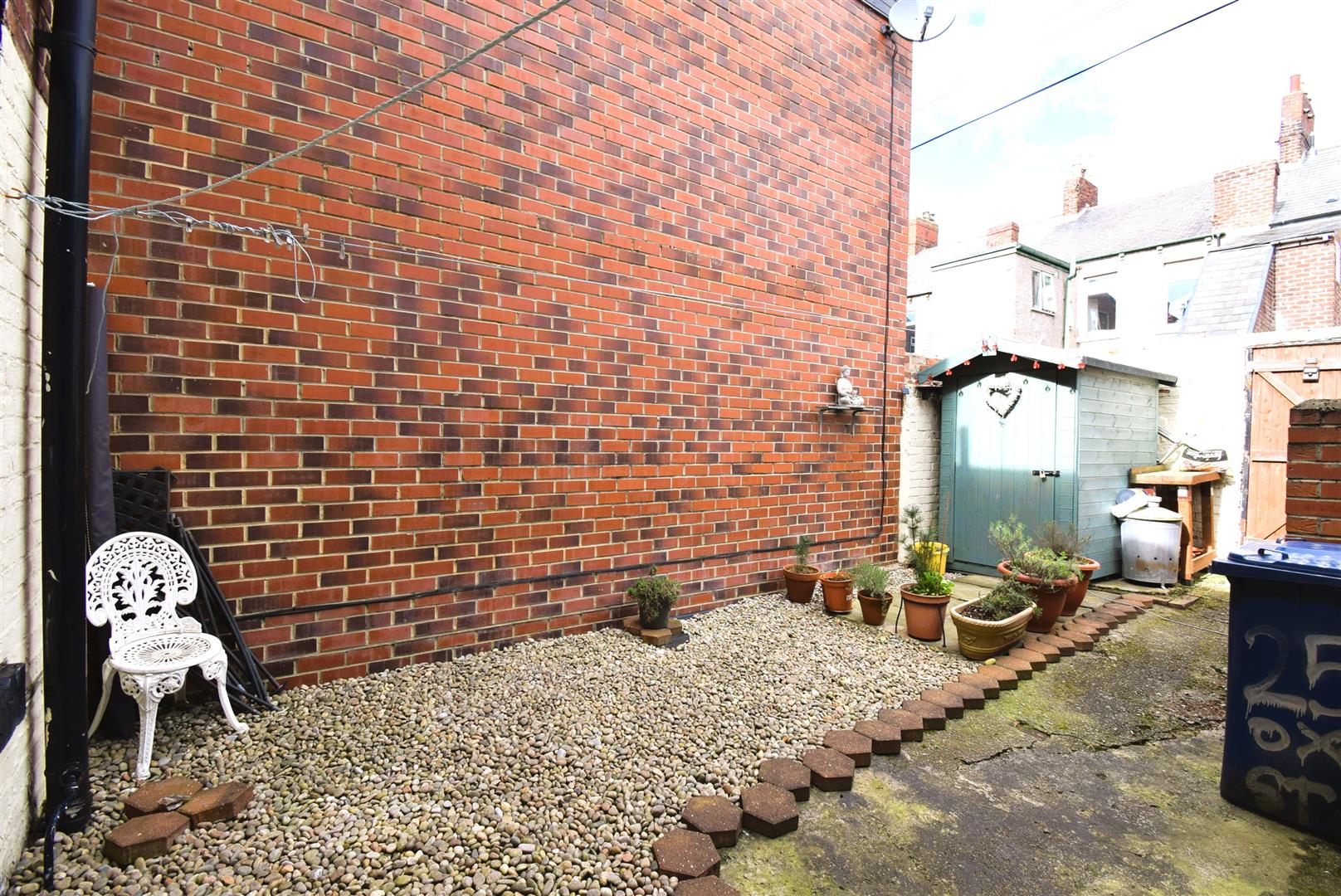 Good sized separate rear yard with pebble area and a garden shed.