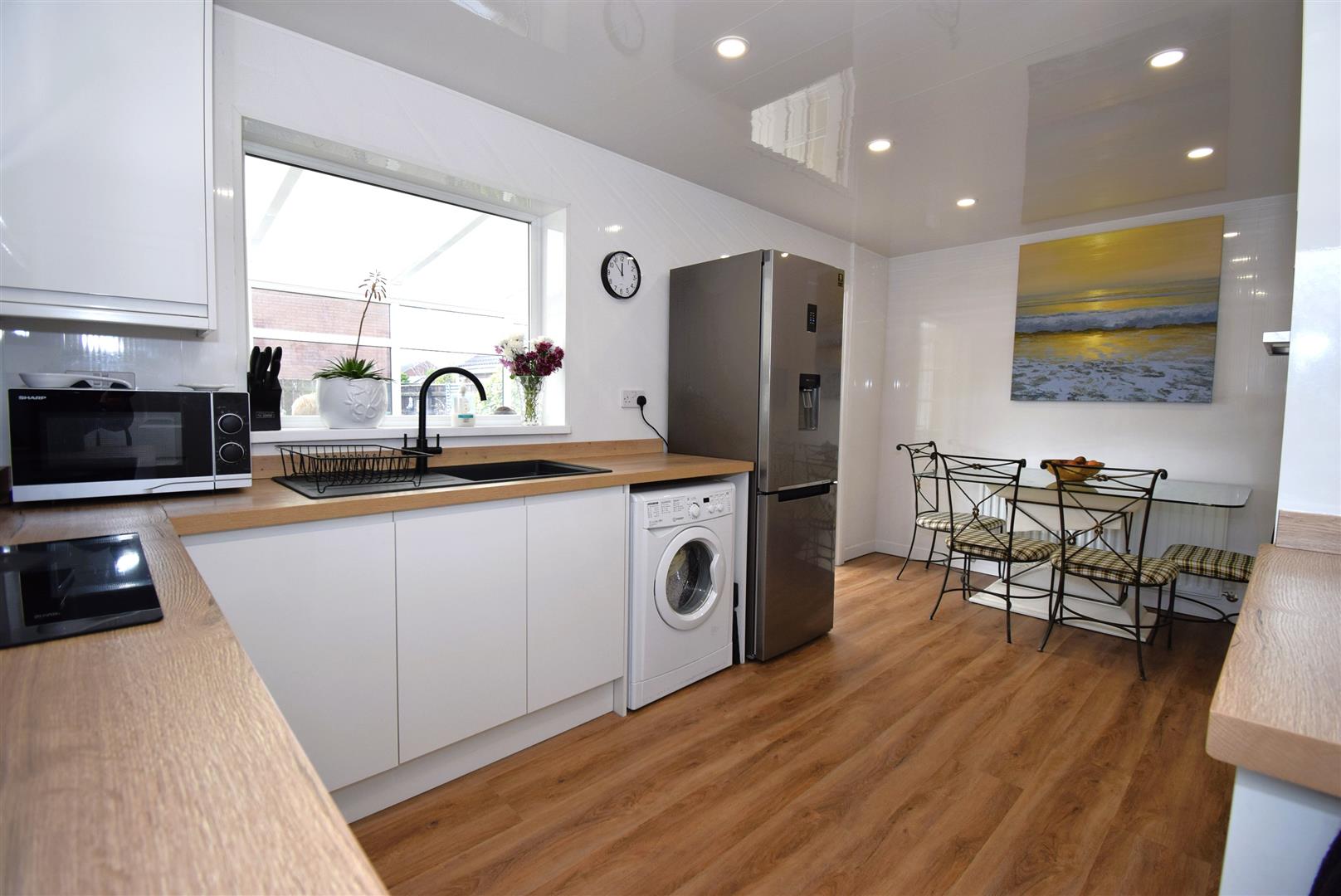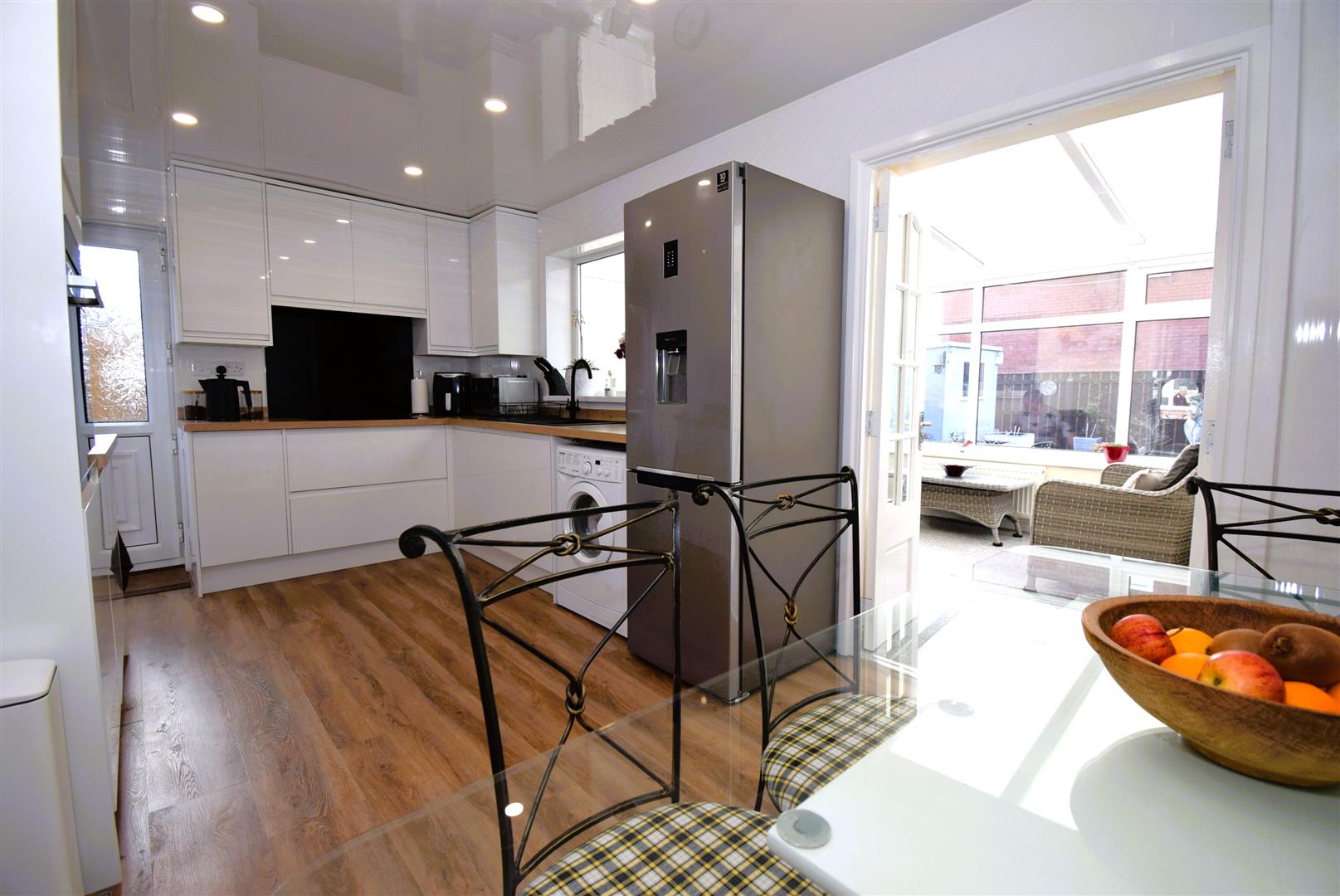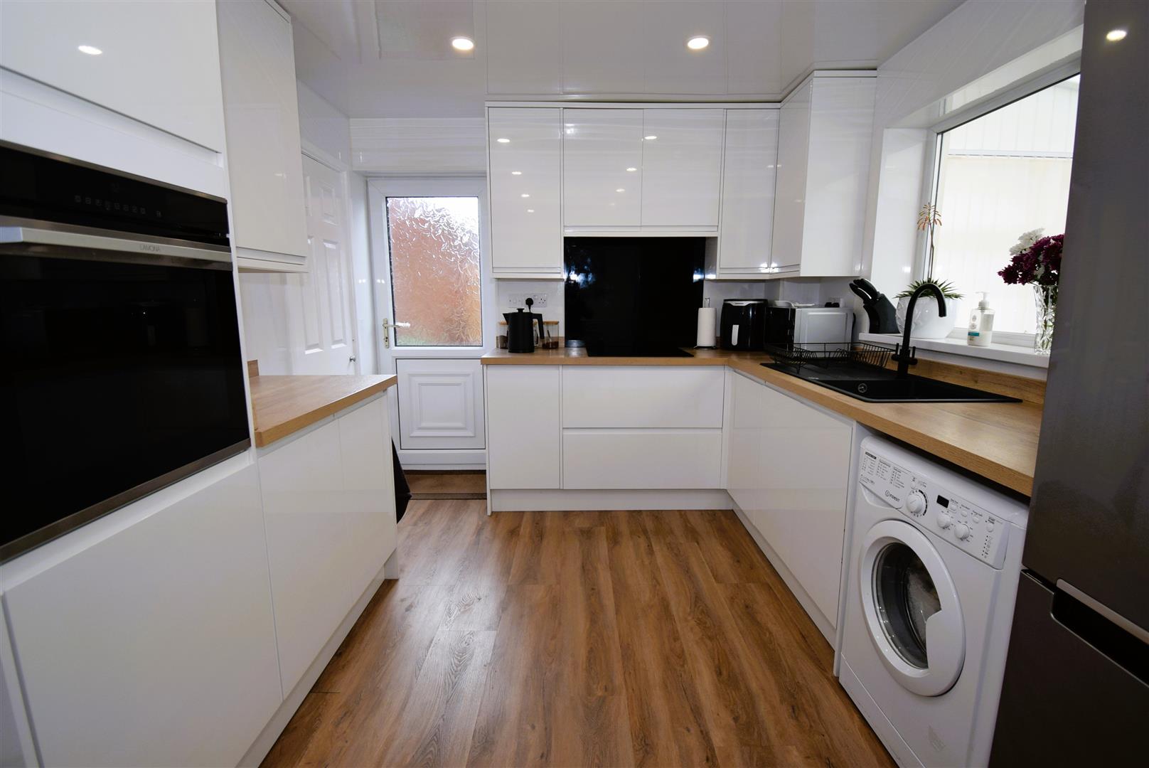 A fitted kitchen, only around two years old, with a range of wall and base units with contrasting work surfaces housing a sink unit, Induction hob, eye level oven, space for appliances, built in cupboard, spot lights, laminate floor and a radiator. French doors lead to the conservatory