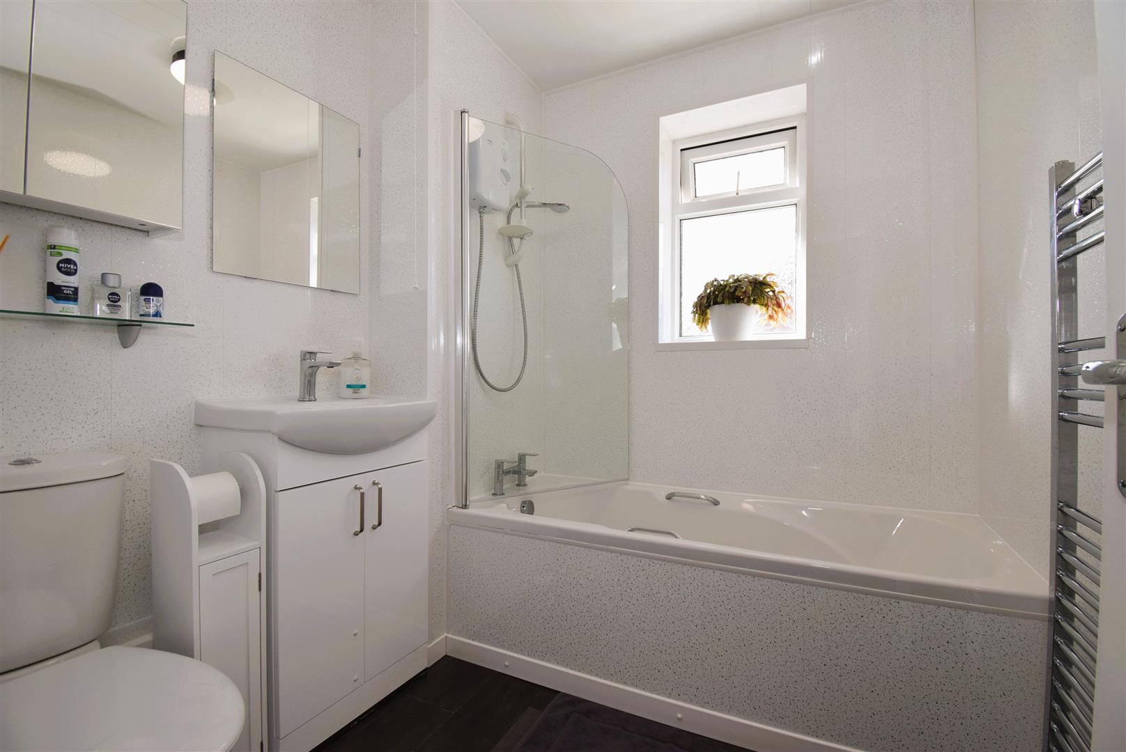 Fitted some two to three years ago with a three piece suite of a bath with an electric shower over and a shower screen, vanity unit with wash basin and a WC, clad walls and ceiling, laminate floor and a chrome towel radiator